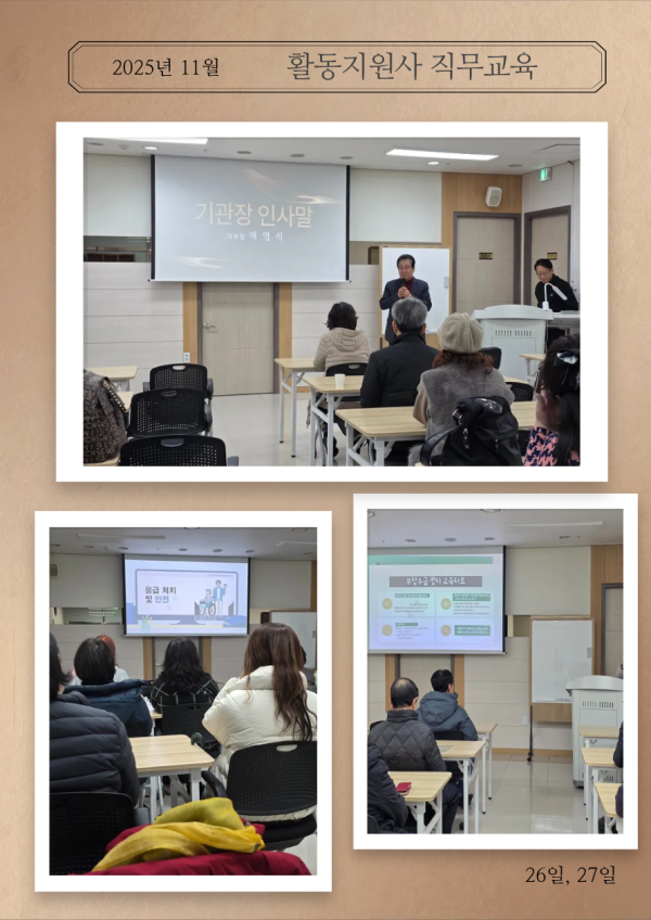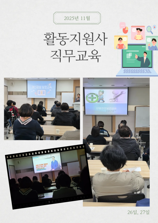 2025년 11월 직무교육 페이지 정보 작성자 최고관리자 댓글 0건 조회 41회 작성일 25-12-04 17:01 본문 2025년 11월 활동지원사 직무교육 목록 이전글2025년 광명시장애인단체연합회 25.12.11 다음글360도 돌봄 '체육활동' 25.11.24 댓글목록 댓글목록 등록된 댓글이 없습니다.