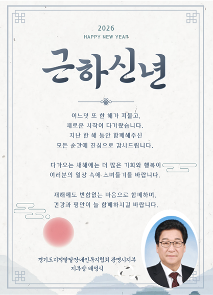 2026년 새해 인사 페이지 정보 작성자 최고관리자 댓글 0건 조회 11회 작성일 26-01-05 16:44 본문 ^o^ 목록 다음글광명시지부 소식지 25.12.23 댓글목록 댓글목록 등록된 댓글이 없습니다.